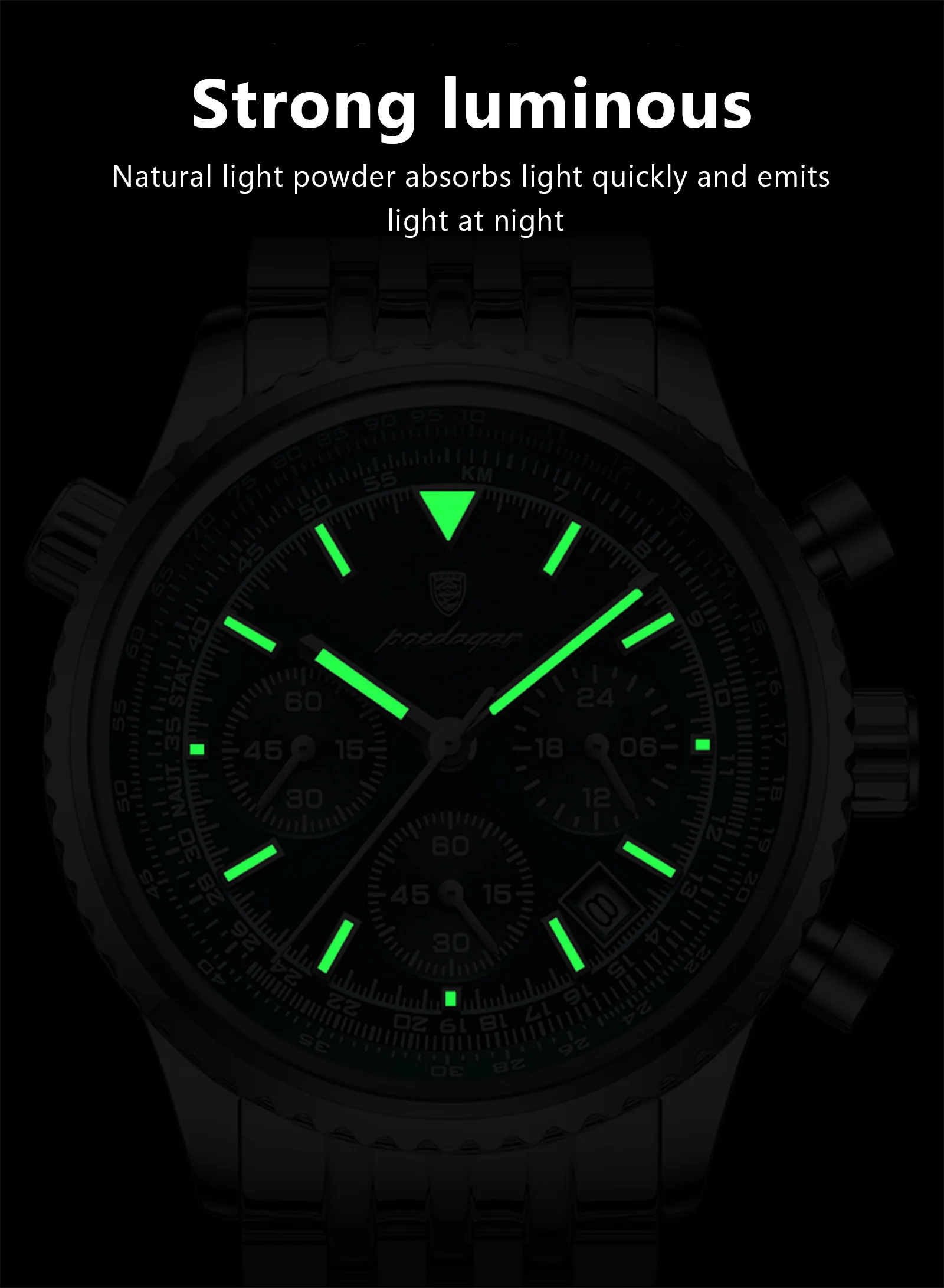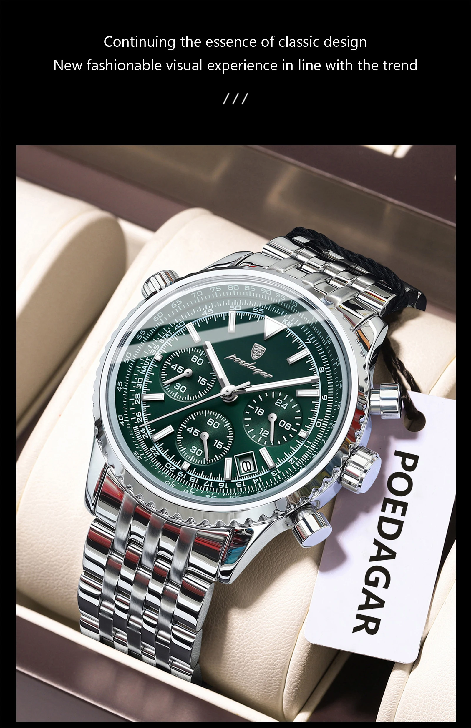 Tick-tock, meet your new wrist companion! This POEDAGAR timepiece brings serious style to your everyday hustle with a sleek stainless steel build and a commanding 40-44mm dial. Packed with features like luminous hands for those late-night moments, an auto-date window, and a chronograph for timing life's important beats, it's equal parts sophisticated and sporty. Water-resistant up to 3 bars, so splashes and swims won't slow you down. The quartz movement keeps things ticking smoothly, while the push-button clasp ensures your watch stays put. Whether you're closing deals or catching waves, this versatile timepiece has got your backβall wrapped up in a sharp, casual-meets-professional aesthetic that works with any outfit.