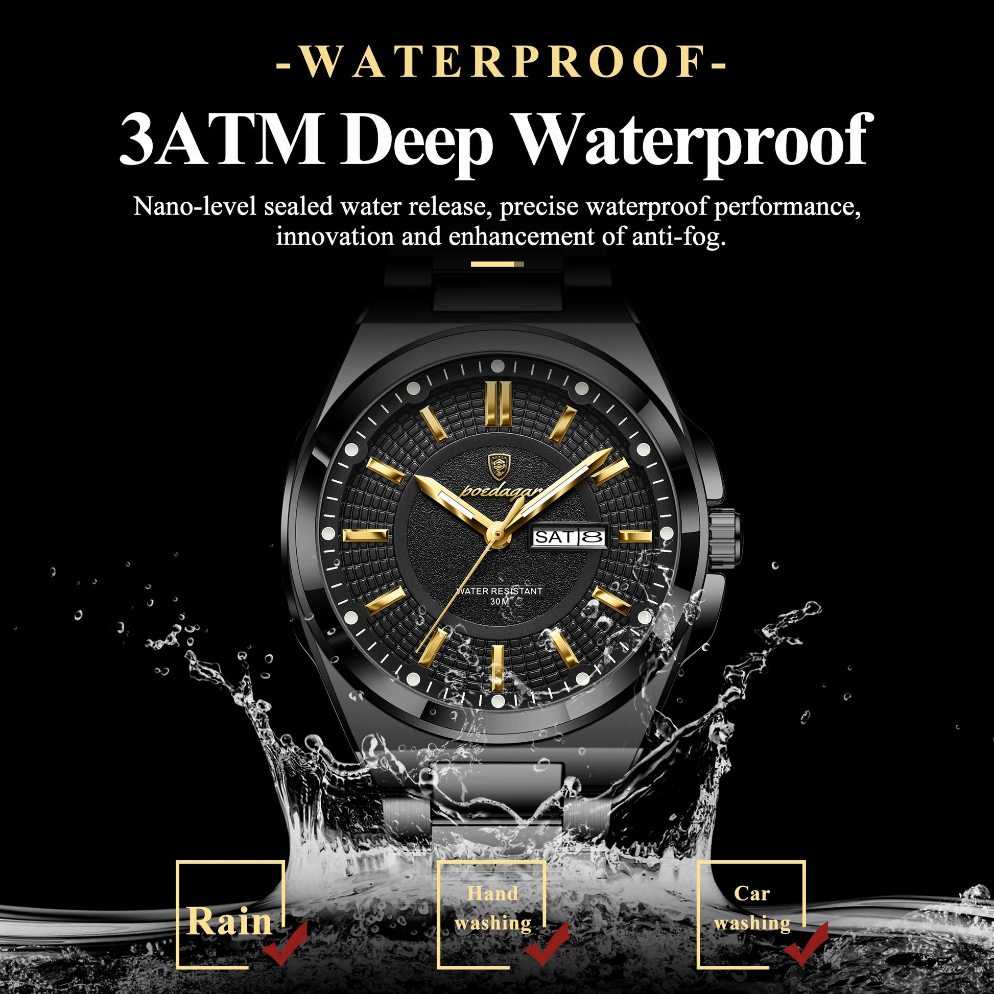 Tick-tock, meet your new wrist companion! This POEDAGAR quartz watch blends timeless style with modern functionality. Featuring a sleek stainless steel case and band, it's built to handle daily splashes and swims with its 3-bar water resistance. The luminous dial keeps you on schedule with auto-date and week display, while the hardlex window protects against scratches. With a comfortable 40-44mm face and push-button clasp, it's the perfect balance of sophistication and casual charm. Includes everything you need: watch, box, adjustment tool, cleaning cloth, and warranty card. Time to upgrade your accessory game!
